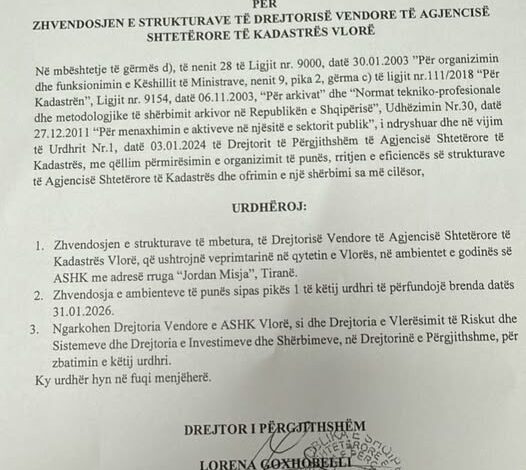 Drejtoria rajonale e Kadastres se Vlores me urdher administrativ zhvendoset nga qyteti i Vliores ne Tirane. Ky urdher, detyron administraten ekzistuese te Kadastres vendore qe brenda dates 31.01.2026 te jete e vendosur ne zyrat e percakltuara nga urdheri i Drejtores se Pergjithshme te Agjencise, zonjes Lorena Goxhobelli.